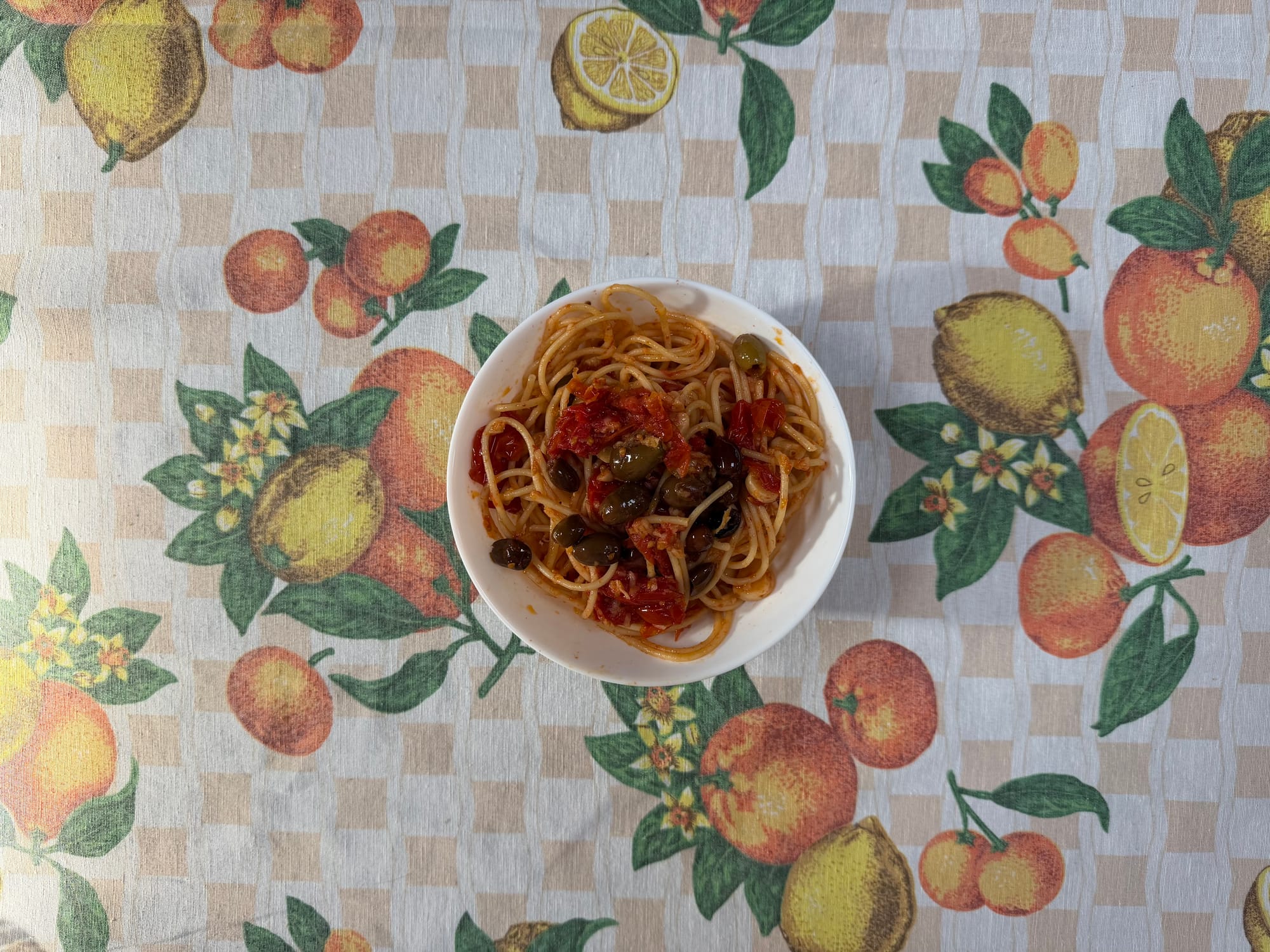 Pasta in sauce from fresh tomatoes, garlic, and olives (I had another half a bowl.)