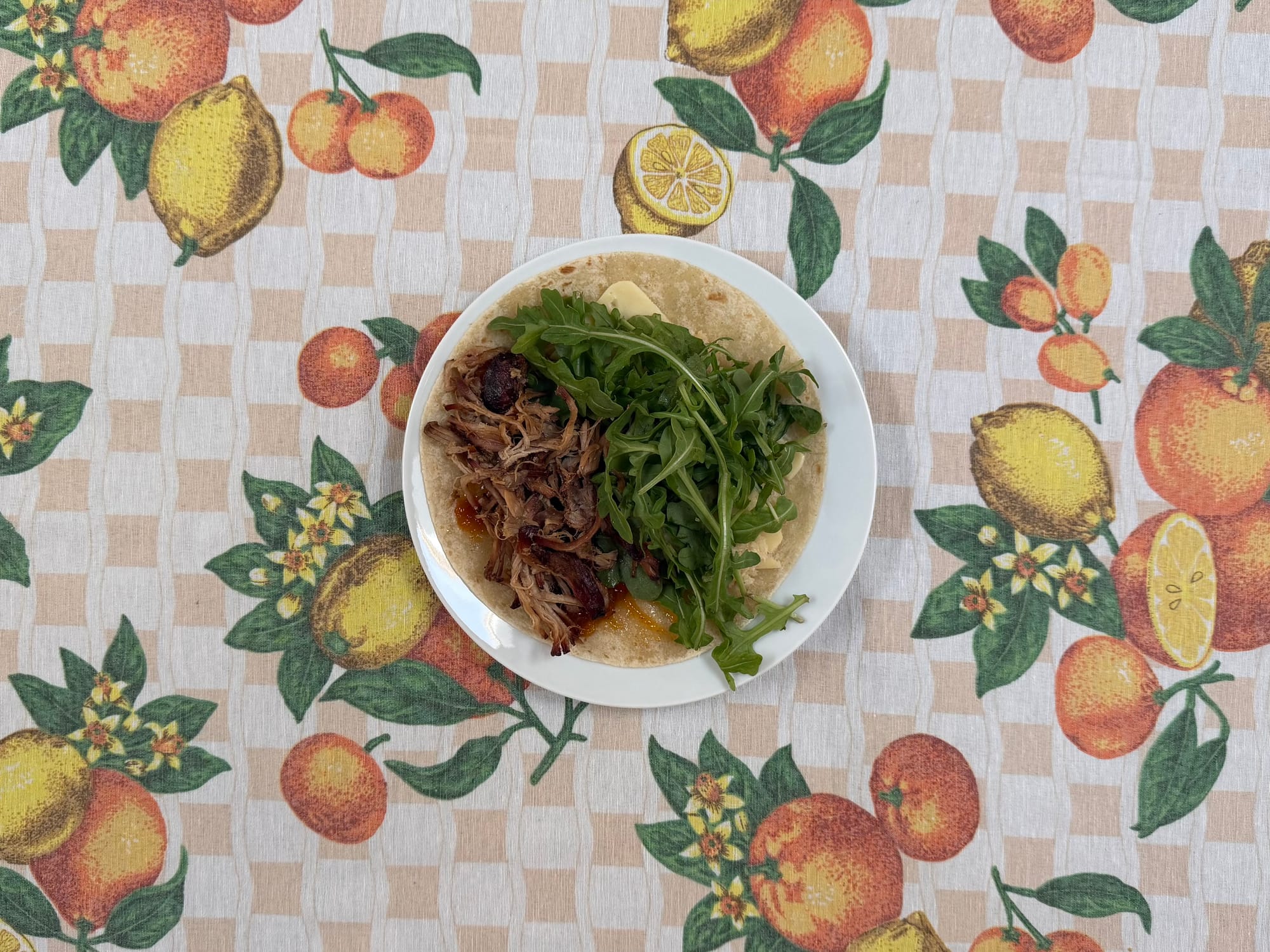 Leftover pulled pork, arugula, cheese, and chutney wraps (I had three.)