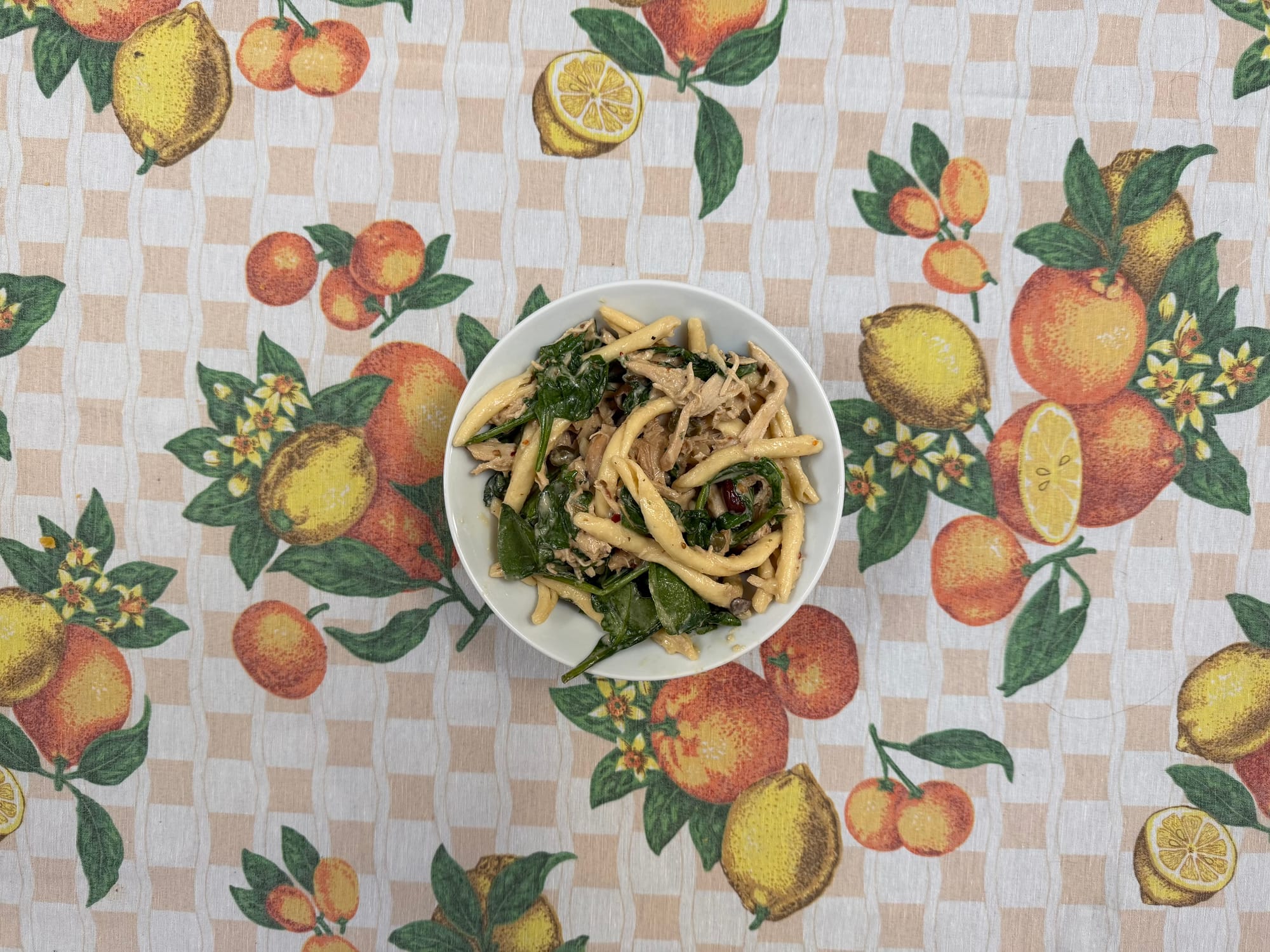 Pulled chicken, olive, spinach, cream pasta (I had two bowls.)